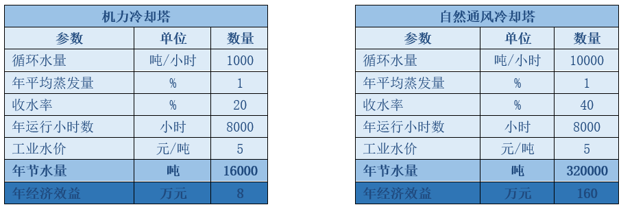 自然通風冷卻塔:循環水量:5000m3/h;年節水量:160000噸;環境溫度≥-15℃、相對濕度不超過60%時無可視白霧現象。